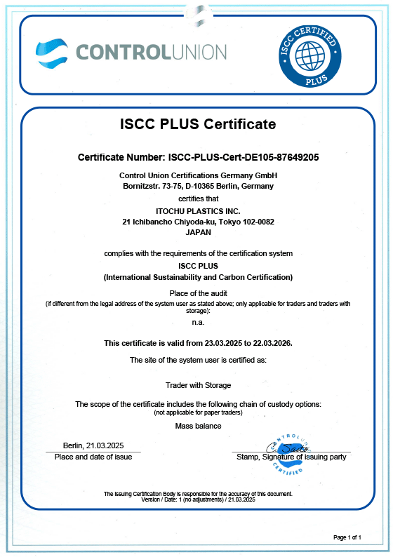 2021年3月よりマスバランス認証であるISCC PLUS認証を取得し、ISCCの要求事項を遵守して認証運用を継続実施中。